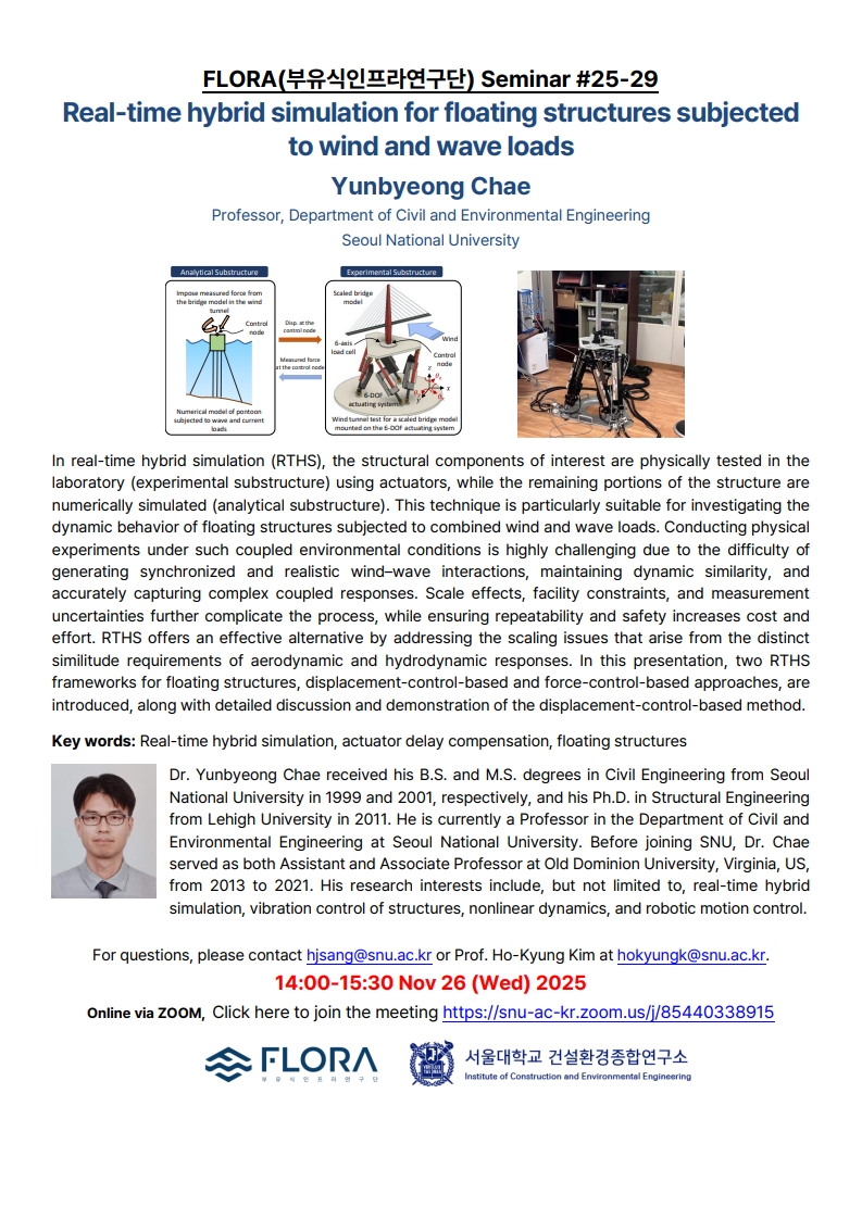 FLORA Seminar #25-29 ▣ Topic: Real-time hybrid simulation for floating structures subjected to wind and wave loads ▣ Speaker: 채윤병 교수/ 서울대학교 ▣ Time: Nov 26 (Wed), (14:00 ~ 15:30) ▣ Venue: https://snu-ac-kr.zoom.