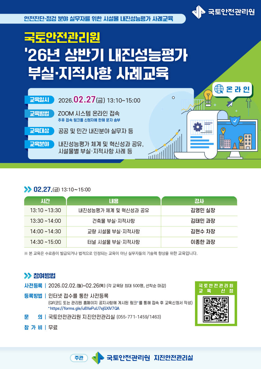 [국토안전관리원] 26년 상반기 내진성능평가 부실·지적사항 사례교육(온라인) 신청 안내