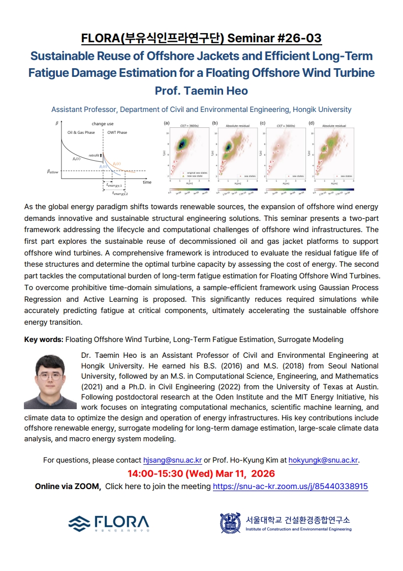 FLORA Seminar #26-03 ▣ Topic: Sustainable Reuse of Offshore Jackets and Efficient Long-Term Fatigue Damage Estimation for a Floating Offshore Wind Turbine ▣ Speaker: 허태민 교수 / 홍익대학교 ▣ Time: 14:00-15:30 (Wed) Mar 11, 2026 ▣ Venue: Zoom, https://snu-ac-kr.zoom.us/j/