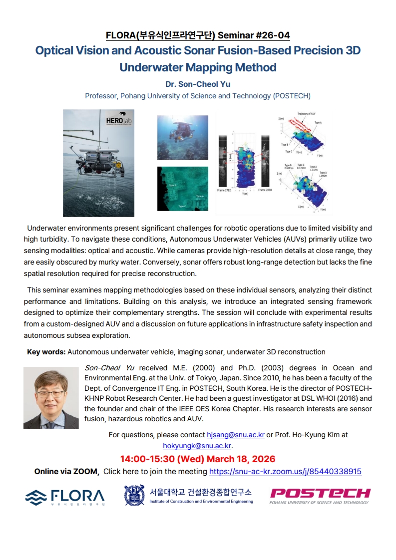 [FLORA Seminar #26-04] ▣ Topic: Optical Vision and Acoustic Sonar Fusion-Based Precision 3D Underwater Mapping Method ▣ Speaker: 유선철 교수 / 포항공과대학교 ▣ Time: 14:00-15:30 (Wed) Mar 18, 2026 ▣ Venue: Zoom, https://snu-ac-kr.zoom.us/j/ 자세한 사항은 첨부 포스터를 참고 부탁드립니다. 별도 발표자료를 제공하지는 않습니다.